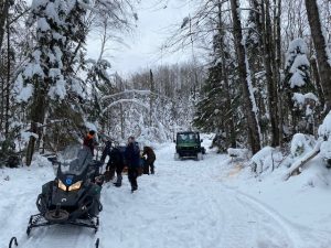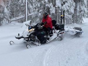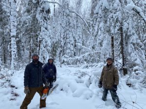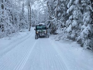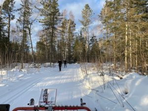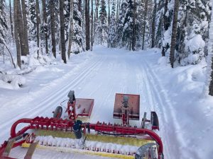 Warmup and Wolf Looped trails were groomed and track-set this morning. Conditions are mostly good, but a little rough in the areas that had numerous windfalls. Use your ‘B’ skis. Snowshoers reported the Mercer Springs trail is in great shape, with some snow-covered trees bent over the trail. The Flowage Trailhead has not opened for skiing. MECCA is 20% open from the Chalet Trailhead. Grooming team and volunteers put in over 75 hours this week removing windfalls and are scheduled for a work bee on Monday.