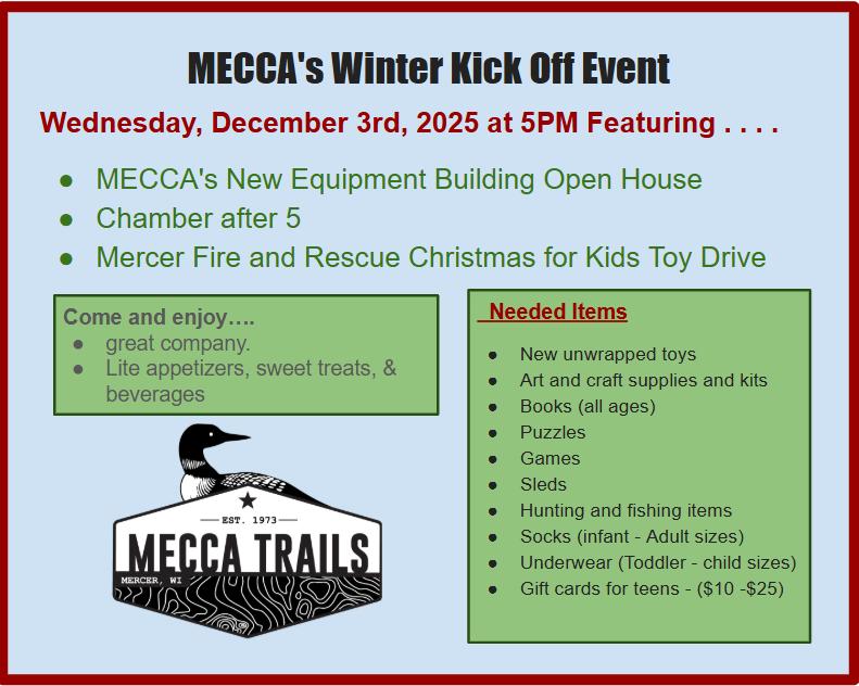 On Wednesday, December 3rd, MECCA and the Mercer FIre and EMS Departments are co-sponsoring the Mercer Chamber of Commerce “Live at 5” event at the Chalet Trailhead. The event is in conjunction with the Iron County Fire Association annual toy drive, attendees are encouraged to bring an unwrapped holiday gift for kids ages infants through teens.